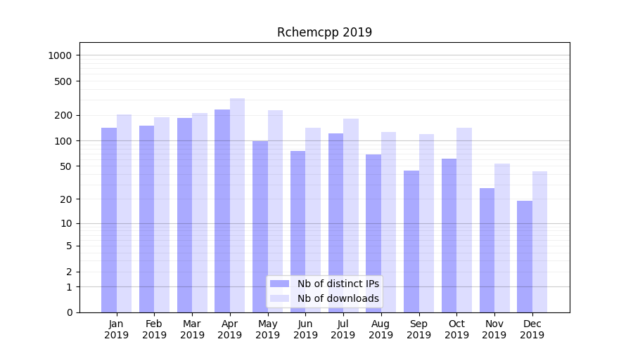 Number of downloads for software package Rchemcpp, year by year, from 2025 back to 2014 (years with no downloads are omitted):