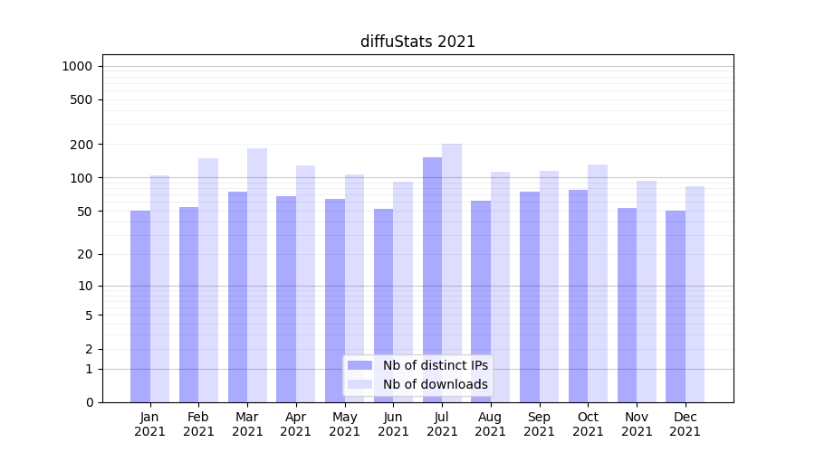 Number of downloads for software package diffuStats, year by year, from 2025 back to 2014 (years with no downloads are omitted):