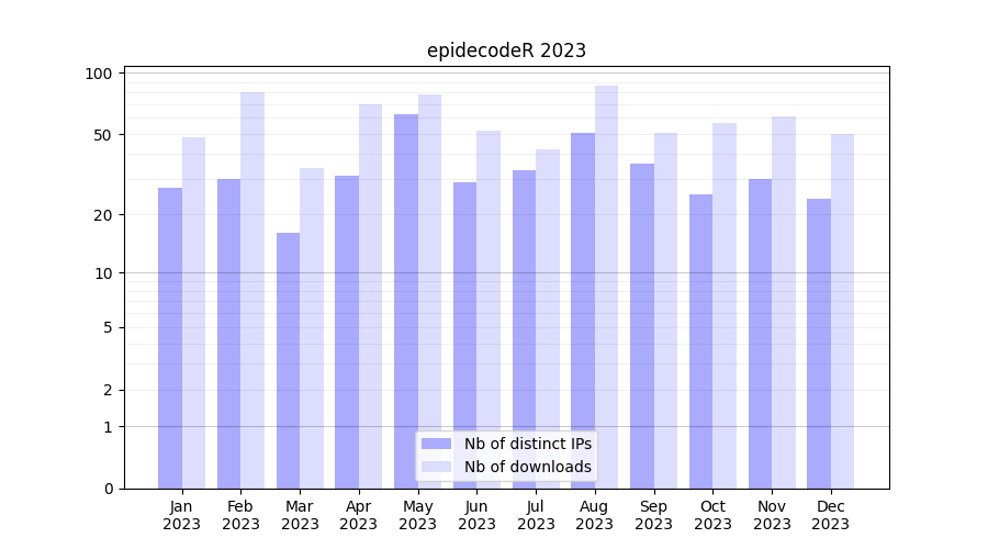 Number of downloads for software package epidecodeR, year by year, from 2025 back to 2014 (years with no downloads are omitted):