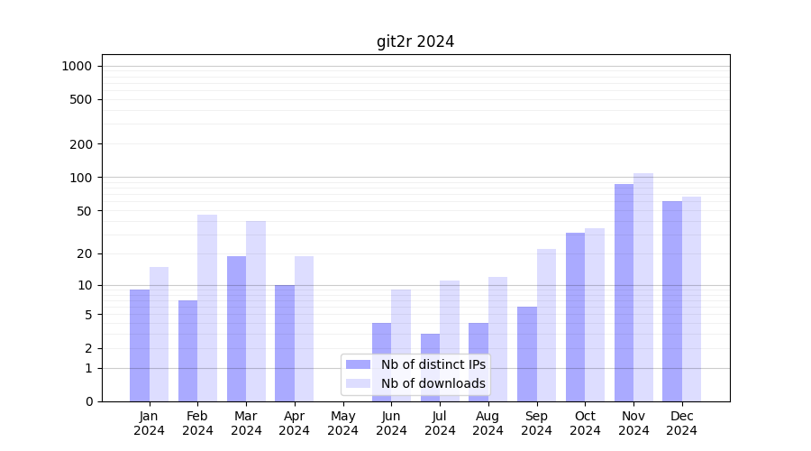 Number of downloads for software package git2r, year by year, from 2025 back to 2014 (years with no downloads are omitted):