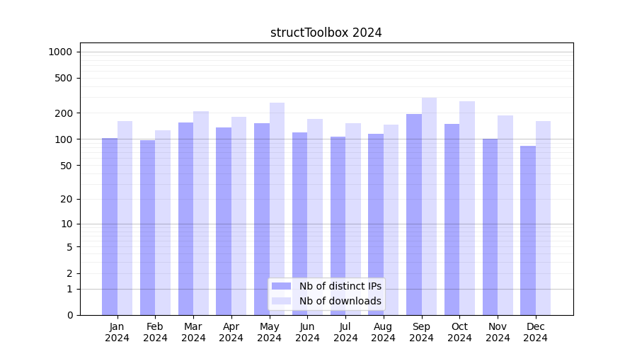 Number of downloads for software package structToolbox, year by year, from 2025 back to 2014 (years with no downloads are omitted):