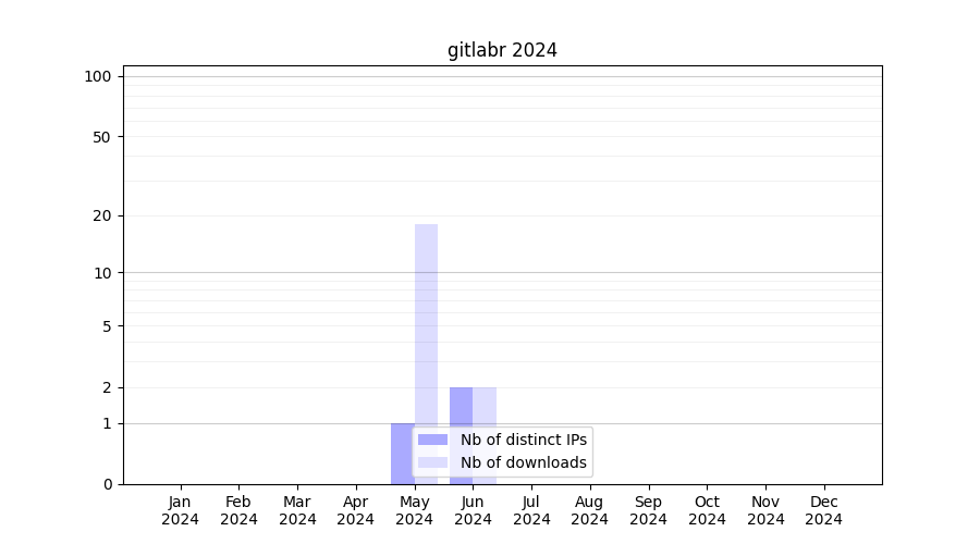 Number of downloads for annotation package gitlabr, year by year, from 2025 back to 2014 (years with no downloads are omitted):