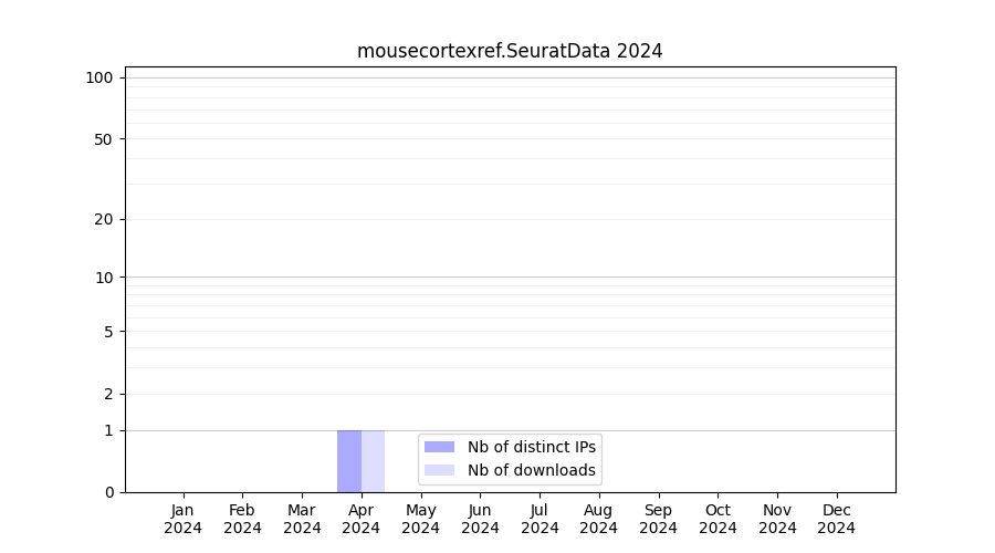 Number of downloads for experiment package mousecortexref.SeuratData, year by year, from 2025 back to 2014 (years with no downloads are omitted):